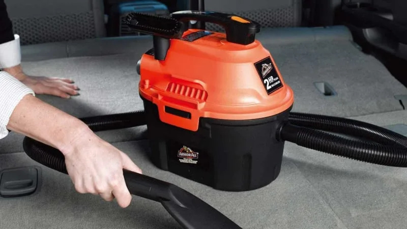 This Armor All vacuum is a traditional wet/dry utility vac with a 2.5 gallon polypropylene tank. It has a 10-foot cord with a cord wrap that plugs into a standard electrical outlet; unfortunately this one doesn’t plug directly into your lighter port. In addition to being a vacuum, it also has a blower function. The vac includes a 6-foot x 1¼-inch hose, a reusable cloth filter, a foam wet filter, a 2-in-1 utility nozzle with brush, a crevice tool, a deluxe car nozzle, a blower nozzle with adapter, and a detail brush.