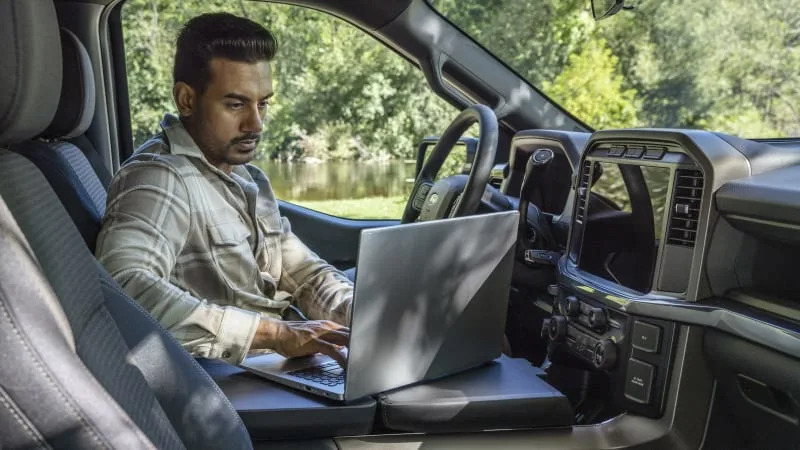 All of the neat features we’ve enjoyed since the beginning of this generation continue. Five-passenger F-150s offer a center console with a unique armrest lid that unfolds forward to become a flat surface to place a laptop, paperwork or road-side picnic. To make this origami possible, the shifter uniquely motors forward into a recess, though only when parked (pictured below). The fold-flat seat is still available, and you’ll have a field day going through all the various ports and storage solutions on offer throughout the cabin.